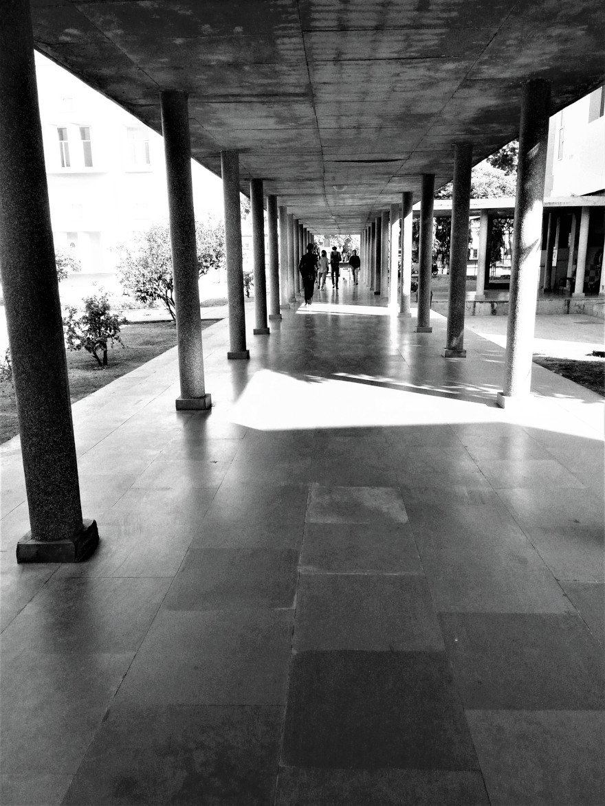 Just after 1 PM or perhaps just before on a warm October afternoon. Thought that with the less crowd flow, I could finally take a photo of this walkway connecting E to F and D blocks, incorporating symmetry and restarting my dormant Instagram with something different. The black and white is a tribute to my bravado on getting inspired by Raghu Rai. Sigh!